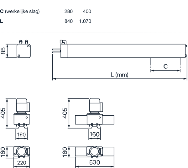 - Piston verplaasting (mm)280 / 400 / 500 / 600 / 700 / 800 / 900 / 1.000